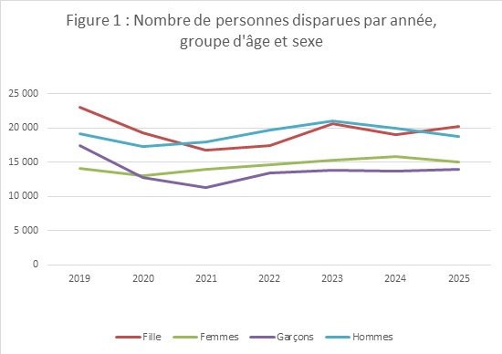 Dans l’ensemble, le nombre de personnes portées disparues a diminué de 1% en 2025, passant de 69,152 personnes en 2024 à 68,349 en 2025, un total qui se situe à 8 % plus bas que les chiffres relevés avant la pandémie de COVID (soit en 2019). La figure 1 souligne que l’incidence la plus dramatique constatée durant la pandémie concernait le nombre d’enfants disparus (âgés de moins de 18 ans). Le nombre de disparitions pour ce groupe d’âge n’est pas encore retourné aux niveaux précédant la pandémie de COVID. Quant à lui, le nombre d’adultes disparus est supérieur au niveau de 2019 depuis quatre ans. Bien que le nombre de femmes adultes portées disparues ait dépassé les chiffres de 2019 depuis 2022, le nombre d’hommes adultes portés disparus ne les a pas dépassés cette année, avec 512 personnes de moins.